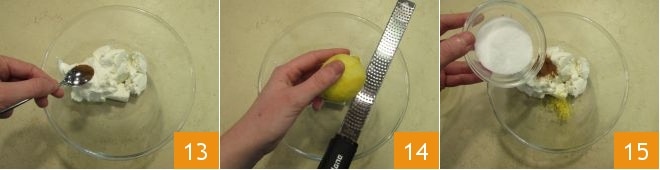 Then season with cinnamon 13, grated lemon zest 14. Add the sugar 15.