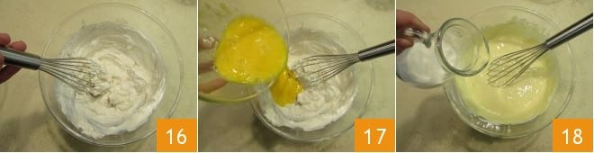and mix everything briefly with a hand whisk 16. Complete by pouring lightly beaten eggs 17, fresh liquid cream 18.
