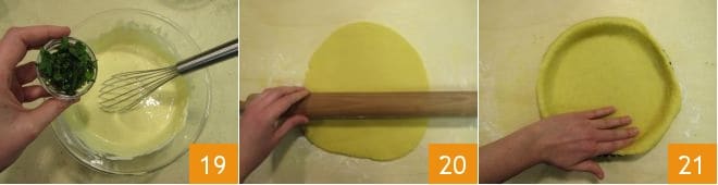 and mint leaves (gently cleaned with a cloth) minced with a knife; pour it immediately after mincing to retain flavor and aroma 19. Take the base, remove the plastic wrap, and roll it out with a rolling pin on a lightly floured surface 20. You will need to create a sheet capable of lining a mold (with a removable bottom) 9 inches in diameter. With the help of the rolling pin, unroll the sheet obtained onto the mold 21.