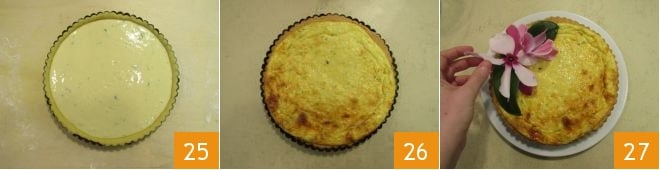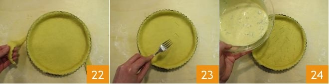 Remove excess dough 22 and prick the base with the prongs of a fork 23. Then pour in the cream 24.
