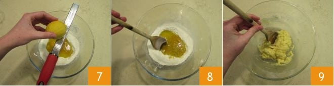 Finally, flavor with grated lemon zest 7. Mix with a wooden spoon 8 until you get a homogeneous mixture 9.