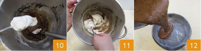 Then incorporate them into the chocolate mixture a little at a time 10: initially add a couple of tablespoons and stir to soften the chocolate mass, then continue to incorporate the remaining egg whites, mixing from the bottom up 11 to not deflate it. Continue this way until you obtain a smooth, lump-free, and frothy mixture. Butter and flour a 9.5-inch cake pan and pour the batter you've prepared into it 12.
