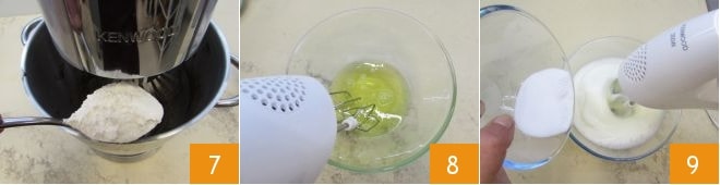 Once a uniform mixture is obtained, sift the flour, corn starch, and baking powder and add them a little at a time 7, keeping the mixer on at low speed until you achieve a smooth and compact dough. At this point, start beating the egg whites until stiff 8, adding the remaining sugar only when they are already white and frothy 9.