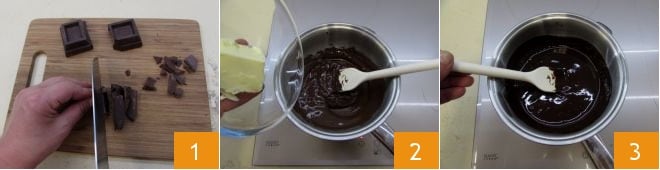 To prepare the Black Forest cake, start with the chocolate base. Roughly chop the dark chocolate 1 and melt it in a bain-marie, ensuring that the bowl does not touch the water below. When the chocolate is completely melted, add the butter 2; let it melt completely, stirring with a wooden spoon 3, then let it cool slightly.