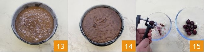 Level the surface with a spatula 13 and bake in a preheated static oven at 350°F for 50 minutes (or at 320°F for 40 minutes if using a fan oven); to check the baking, do a toothpick test: if it comes out completely dry, the cake is done, otherwise, you will need to bake it for a few more minutes. When ready, take it out of the oven 14, let it rest for 5 minutes, then remove it from the mold, placing it on a plate or a cooling rack. In the meantime, prepare the cherries; pit them 15 (set aside 17 whole ones with stems) and place them in a large non-stick pan;