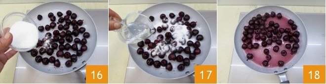 add the sugar 16 and the kirsch 17. Sauté them for a few minutes: the cherries should not break apart but only release the syrup 18.