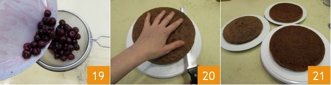 Let them cool, then strain them with a fine-mesh strainer to separate the juice 19 and divide the cherries and juice into two equal parts that you will use to fill the two layers of the cake. As soon as the cake is cold, cut it into three discs of equal thickness 20. Once finished 21, move on to assembling the Black Forest cake.
