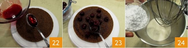Take the first disc and place it on a rather large serving plate, then soak it with part of the cherry syrup you set aside 22, then arrange some of the cherries on the surface 23. Then prepare the Chantilly cream, whipping the cream together with the powdered sugar 24;