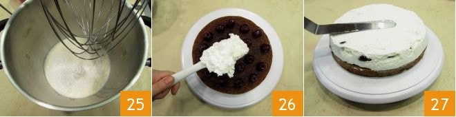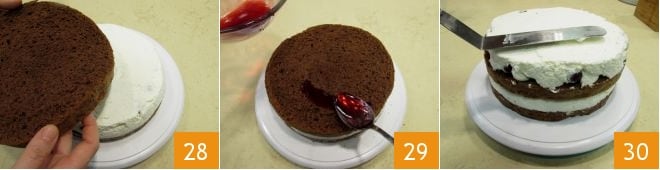 cover with the second disc 28. Then continue with the second layer, pour the syrup 29 and then the cherries, and finally another layer of whipped cream, leveling in the same way 30.