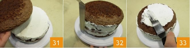 Cover with the last disc 31, finally cover the entire sides 32 and the surface with the cream 33; set aside a couple of tablespoons that you will use for the final decoration.