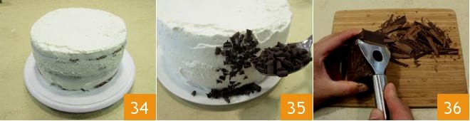 Once completed 34, with the help of a spoon, make the chocolate curls adhere along the outer circumference 35; slightly soften the dark chocolate in the microwave, 3-4 seconds will suffice, and grate it with a vegetable peeler to create curls 36.