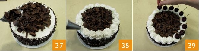 Distribute them on the surface of the cake, leaving a few inches from the edge 37. Put the chantilly cream in a piping bag with a star nozzle and decorate the edge of the cake with pretty tufts 38; place a whole cherry on each 39. Once completed, let the Black Forest cake set for half an hour in the refrigerator before serving.