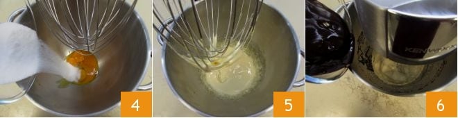 In the meantime, place the egg yolks in a stand mixer with half of the granulated sugar 4, then whip until you obtain a light and fluffy mixture 5. Pour the now lukewarm chocolate mixture into the stand mixer's bowl 6.