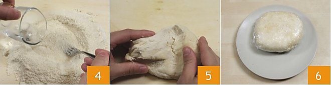 Pour the mixture onto a cold surface and form the classic well in the center, where you will start pouring water little by little, mixing with a fork to gradually gather the flour from the edges 4. Then knead everything quickly until you get a compact and fairly elastic dough 5. Form a dough ball and wrap it in plastic wrap 6, then place it in the fridge for at least 30 minutes.