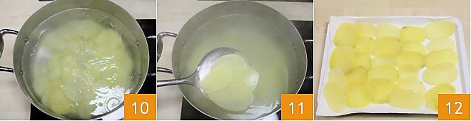 Blanch the potato slices for 5-6 minutes 10, then drain them with a slotted spoon 11 and transfer them to a baking tray lined with parchment paper to dry, trying not to overlap the slices 12.