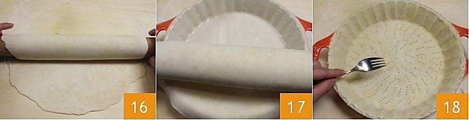 Then, take the shortcrust pastry dough from the fridge, shape it into a round shape with your hands, and roll out the dough with a rolling pin to a thickness of 1/8 inch 16. Line the pie pan with the rolled-out shortcrust pastry 17. Adhere the pastry to the pie pan and remove the excess dough from the edges with a small knife, then prick the pastry with a fork 18.