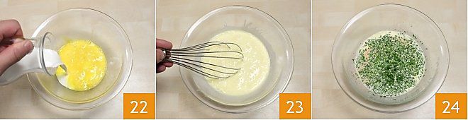 While the base cools slightly, prepare the cream to cover the rustic pie: in a bowl, beat the eggs with a pinch of salt, then pour in the fresh liquid cream 22, mix everything with a whisk 23, add the grated nutmeg and chopped chives 24, combine the ingredients, and set the mixture aside. This will be the covering cream for your pie.