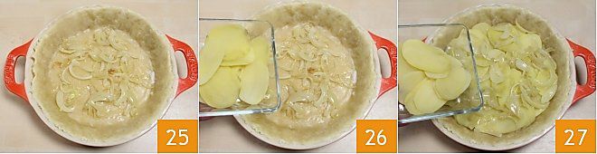 Then start assembling your rustic pie: place a layer of onions on the pastry 25, then add the potato slices and continue alternating the layers until all the ingredients are used up (26-27). Finish with the potato layer.