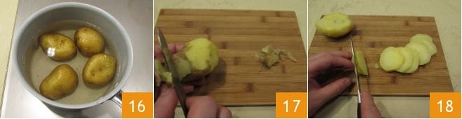 Separately, in a pot, place the cleaned potatoes with their skins and boil for about 30 minutes 16. To speed up the process, you can use a pressure cooker and cook them for 15 minutes. The important thing is that the potatoes do not fall apart during cooking but remain compact. Once cooked, let them cool and then peel them 17, then cut them into slices half an inch thick 18.