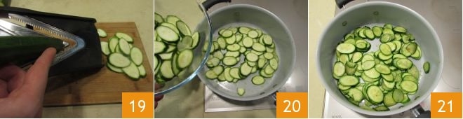 Meanwhile, trim the zucchini and slice them with a mandoline 19. In another pan, heat the remaining oil with the garlic cloves. Once browned, remove them and add the freshly sliced zucchini 20. Cook them over high heat, keeping them crunchy, stirring occasionally, then adjust with salt and pepper 21.