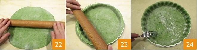 After two hours, take the shortcrust pastry dough and roll it out on the work surface to a thickness of half an inch 22. Butter a 10-inch diameter mold and line it with the rolled-out pastry 23. Prick the bottom with a fork 24.