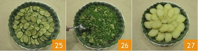 Proceed with the first layer by arranging the zucchini to cover the base 25, then proceed with a layer of peas 26, and finally finish the tricolor savory pie by laying the potatoes 27.