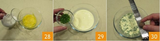 Now prepare a sauce to cover the tricolor savory pie: beat the cream together with the eggs in a bowl 28, then salt, pepper, add the finely chopped chives 29 and grated nutmeg 30.