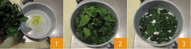 To prepare the tricolor savory pie, start by making the Easy Shortcrust Pastry by cleaning the spinach and transferring it to a non-stick pan with a drizzle of oil 1. Let them wilt for a few minutes and let them cool (2-3).