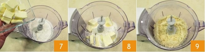 Then combine the flour, cold cubed butter, and salt in a mixer (7-8). Blend for a few moments to obtain a crumbly mixture 9.