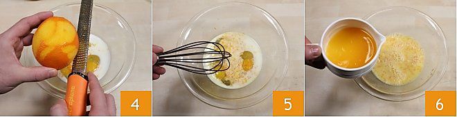 and the grated orange zest 4. Beat the ingredients with a whisk 5, then add the strained orange juice 6 and,