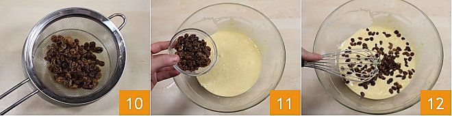 finally, drain the raisins 10, squeeze them out, and add them to the mixture 11, and mix well, still using a whisk 12