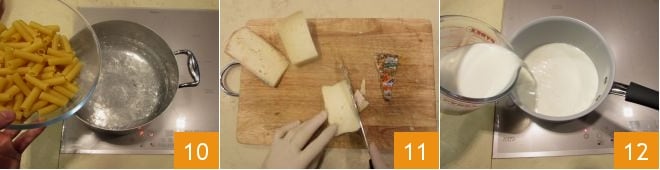When the pasta water is about to boil, cook the tortiglioni al dente 10. In the meantime, you can prepare the cheese béchamel: cut all the cheeses into strips 11, then heat the milk in a small saucepan 12.
