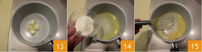 Separately, melt the butter over low heat 13; when the butter has melted, turn it off and add the sifted flour like rain 14, stirring with a whisk to avoid the formation of lumps. Then put it back on low heat and stir until it becomes golden: you will then have obtained the roux 15.