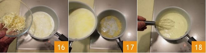 When the milk is about to boil, completely melt the cheeses in the boiling milk 16. Gradually add the milk and cheese mixture to the roux 17, stirring everything vigorously with the whisk. Cook for 5-6 minutes on low heat until the sauce thickens 18 and starts to boil. At this point, turn off the heat and set aside.