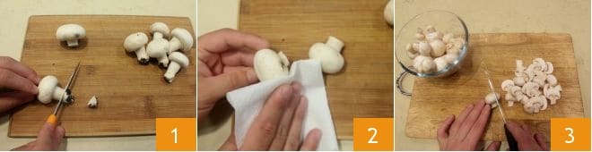 To prepare the messy tortiglioni, start with the How to Clean Porcini Mushrooms; with a sharp knife with a smooth blade, begin to remove the earthy part on the stem 1, scraping it gently until any trace of soil is removed. If the mushrooms are quite clean, remove the few traces of soil with a brush or a cotton cloth 2 (if they are still very dirty, pass them quickly under a jet of cold running water). Once cleaned, cut the whole mushrooms lengthwise 3 and set aside.