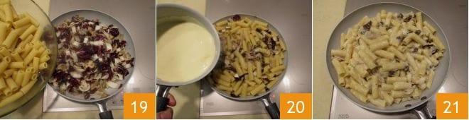 After 12 minutes, the tortiglioni will be al dente: drain them and add them to the sauce you prepared earlier 19. Pour the cheese béchamel over the pasta 20, mixing with a spatula to combine everything well 21.