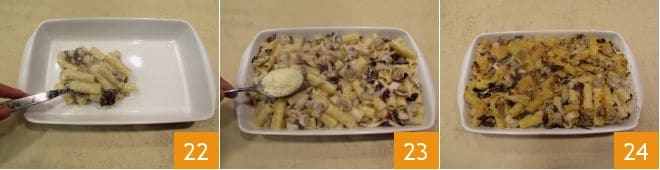 Distribute the tortiglioni in a baking dish 22 and sprinkle with grated cheese 23. Brown the pasta in a preheated static oven at 446°F for 5-6 minutes until it becomes golden and crispy: take your messy tortiglioni out of the oven and serve them hot 24.