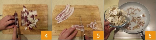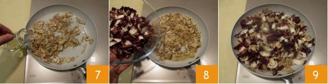 Wash the radicchio under plenty of fresh water and cut it into strips 4. Also cut the pork cheek into strips 5, then brown it in a non-stick pan for 5-6 minutes. When the pork cheek is crispy and golden, add the mushrooms 6;