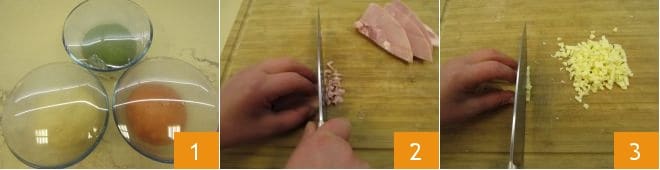 Once all 3 doughs have risen 1, prepare the filling: finely chop both the cooked ham 2 and the provola cheese 3 and set aside.