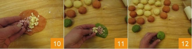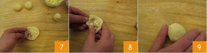 and fill with some cubes of provola cheese and ham 7. Then close, pinching the edges of the dough 8, and form a ball by shaping it on a work surface, rotating with your fingers to give it a spherical shape 9. Continue until you finish the white dough,