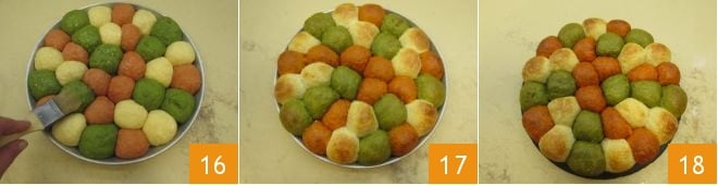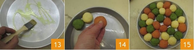 grease a 10-inch mold 13 with the help of a kitchen brush. Place the balls inside, starting from the edge, alternating the colors 14; once you have filled the pan 15, let rise for another 30 minutes, always in the oven turned off with just the light on, covering with plastic wrap.