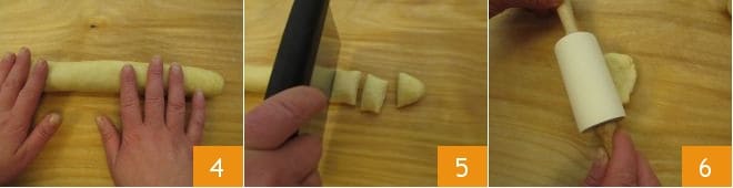 Take the doughs and work each one to shape it into a loaf; you can start with the white one 4. Divide the loaf into 10 pieces, each weighing approximately 1 oz 5. Using a rolling pin 6, flatten and obtain a disk from each portion