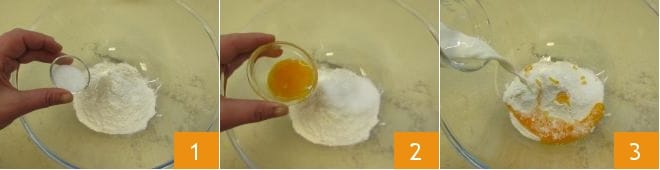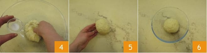 then add the salt 4, continue working for a few minutes on a work surface 5, and after shaping it into a sphere, place it in a bowl 6, cover with plastic wrap, and put it in the oven turned off with just the light on along with the other 2 doughs for a couple of hours, until it has doubled in size.