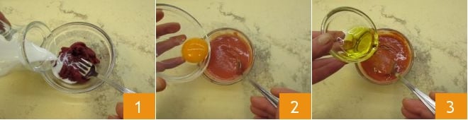 At this point, make the red dough: place the triple concentrated tomato paste in a small bowl, dilute it with room temperature milk 1, and add both the yolk (weighing 18 g) 2 and the olive oil 3. Mix everything until you get a uniform mixture.