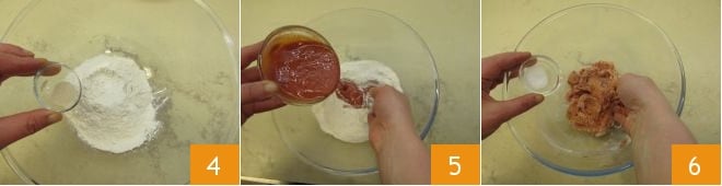 In another bowl, pour the flour, the dry yeast 4, the sugar, and the tomato mixture 5. Start kneading everything by hand, and only when you have obtained a uniform dough, add the salt 6 and continue working to absorb it.