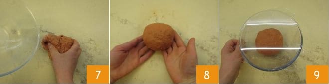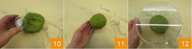 At this point, transfer the dough to a work surface 7, knead it for a few more minutes, then shape it into a sphere 8 as you did previously with the green dough. Place it in a bowl, cover with plastic wrap 9, and let it rise in the oven turned off with just the light on, along with the other dough, for about 2 hours or until it has doubled in size.
