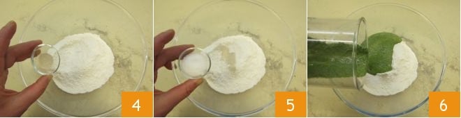 In another bowl, pour the flour, add the dry yeast 4, and the sugar 5. Then add the basil cream 6,