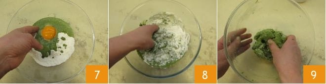 the yolk (weighing 18 g) 7, and start kneading by hand 8 until you get a homogeneous mixture 9.