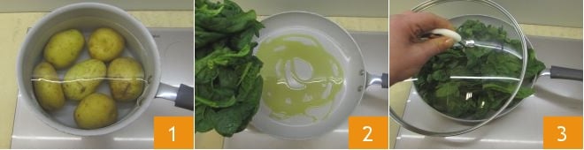 To prepare the tricolor potato gnocchi, wash the potatoes, place them in a pot full of water without peeling them 1, and boil them for about 30 minutes or until they are soft. Meanwhile, take care of the spinach, wash the leaves, then heat the oil in a pan, add the spinach 2, cover with a lid 3, and let them wilt for 5 minutes or until they are tender.