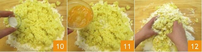 the fine salt 10 and the beaten eggs 11. Now knead vigorously by hand 12